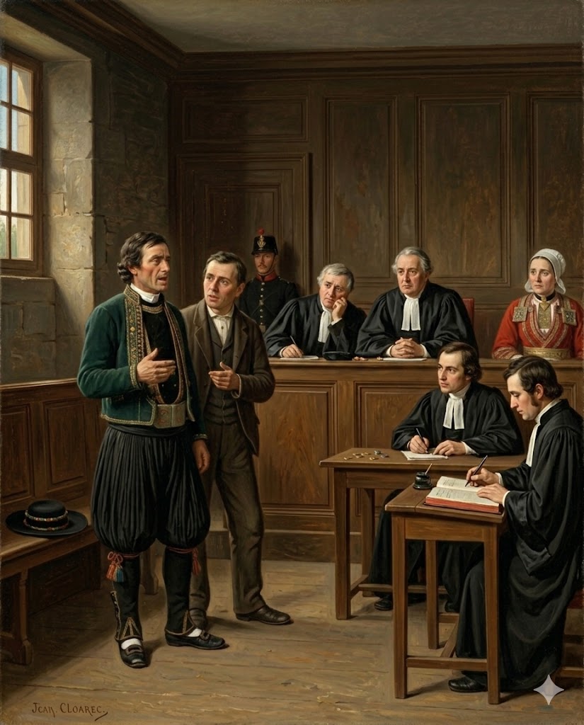 Le 24 mars 1832, pour un procès l’opposant à Pierre-Marie Le Doaré propriétaire du domaine congéable de Keramenez, Jean Cloarec ne prend même pas la peine de venir au tribunal dont le jugement se termine ainsi :”Après avoir attendu jusqu’à une heure de l’après midi sans que les defendeurs aux qualités et demeure que dessus aient comparu ni en personnes ni par fondé de pouvoir, Nous juge de paix avons donné défaut faute de comparoir contre les susdits Jean Le Cloarec et femme et pour le profit, les condamnons aux dépens taxés à treize francs soixante-quinze centimes non compris les coûts et levée du présent jugement en quoi ils sont aussi condamnés[…]”.